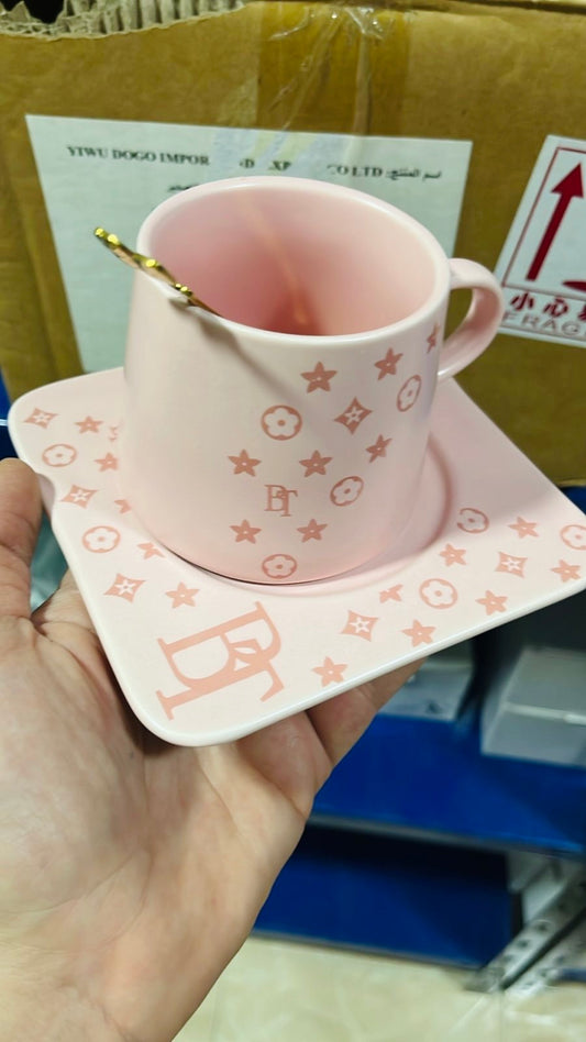 Cute Blush pink mug مج بورسلين طبق و معلقه. (بينك)BT
